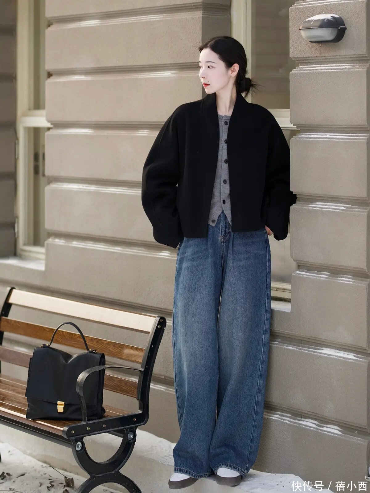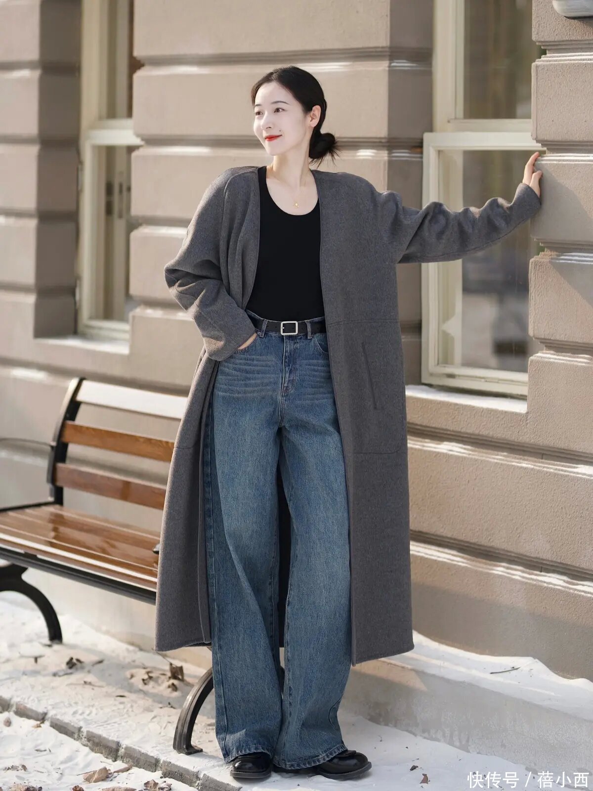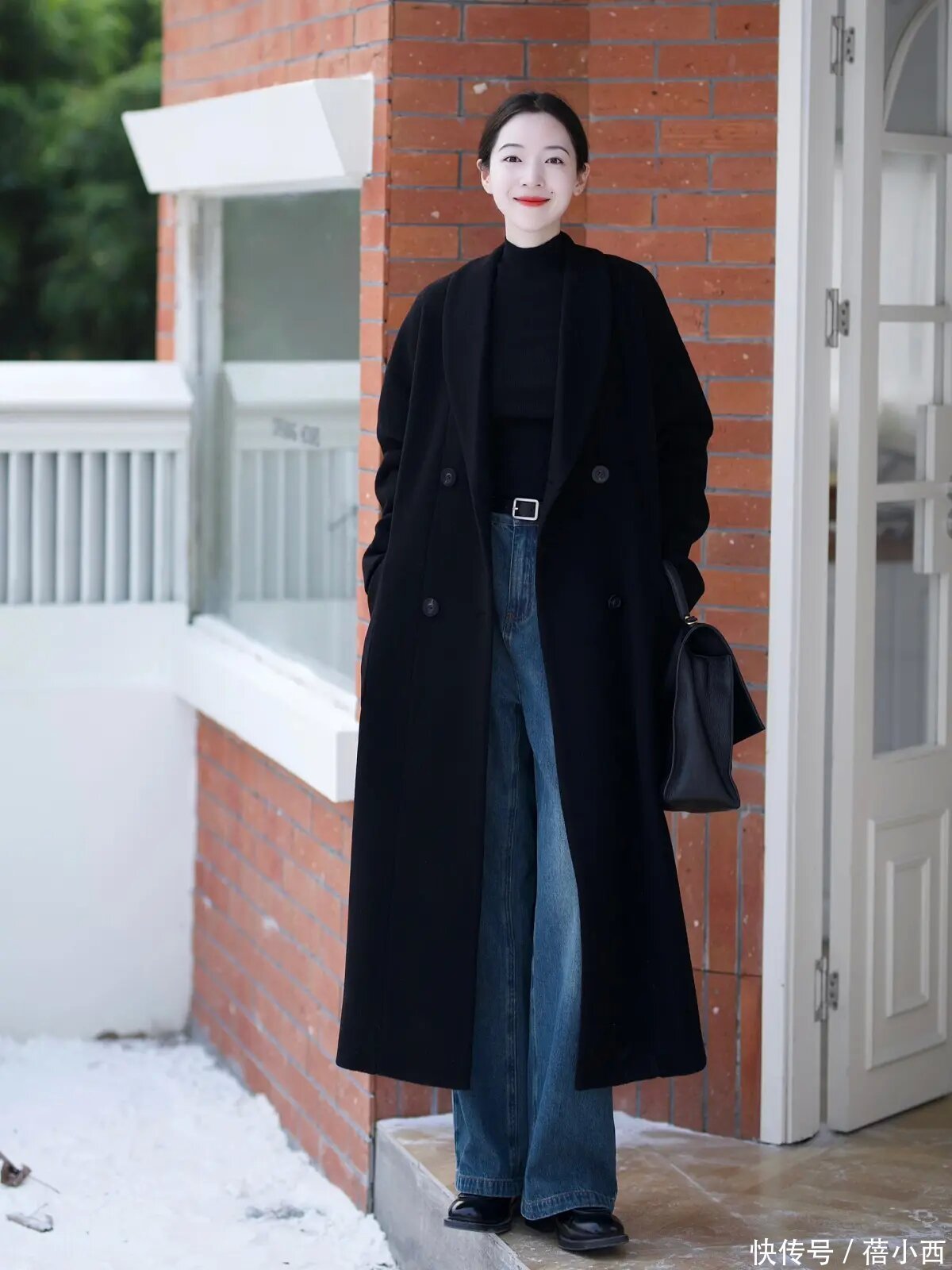 说真话,其实像这么的大衣和牛仔裤的搭配已经蛮经典的,而且腿粗的女生不错径直穿阔腿牛仔裤,展现出一定的失业感,还不错在穿的技艺用这种最经典的玄色大衣去搭配,裁减搭配的繁琐感,显得纯粹利落。