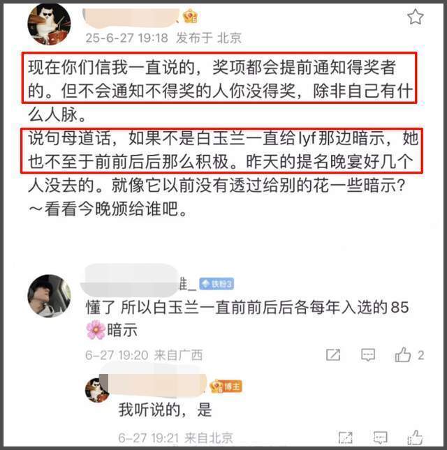 还有网友爆料奖项一般齐会提前奉告获奖东说念主,淌若不是刘亦菲那里接到得奖默示,也不会那么积极干涉行径。要知说念刘亦菲为了干涉白玉兰的提名晚宴,连LV大秀齐没实时出席,而提名晚宴比拟于授奖礼当然是地位不同,马伊琍、杨紫等东说念主齐没干涉提名晚宴,只等授奖礼这说念“正菜”。