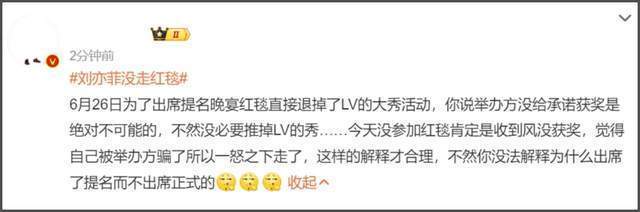 但又有大V爆料刘亦菲上昼齐准备好造型和投降了,下昼得知没能获奖,就平直决定不去了。以至还有疑似现场媒体爆料刘亦菲齐到了又离开了,这样离谱的吗?
