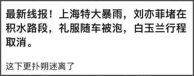 还有东说念主透露刘亦菲不是有益不去,是因为上海暴雨,堵在积水路段,投降随车被泡了,是以只可取消行程。